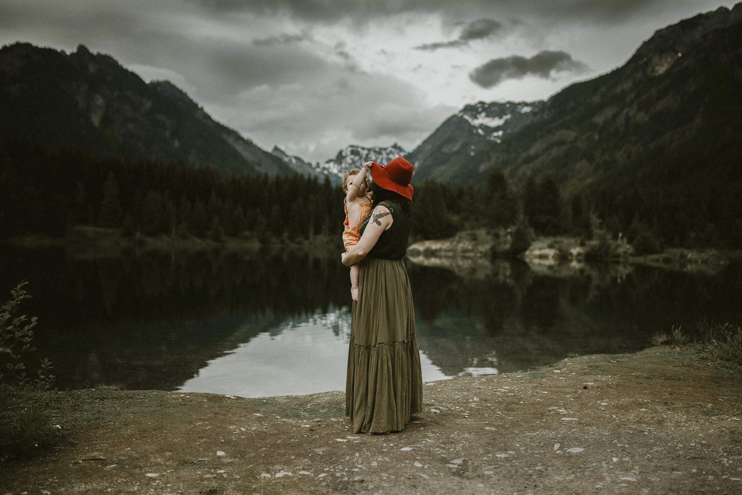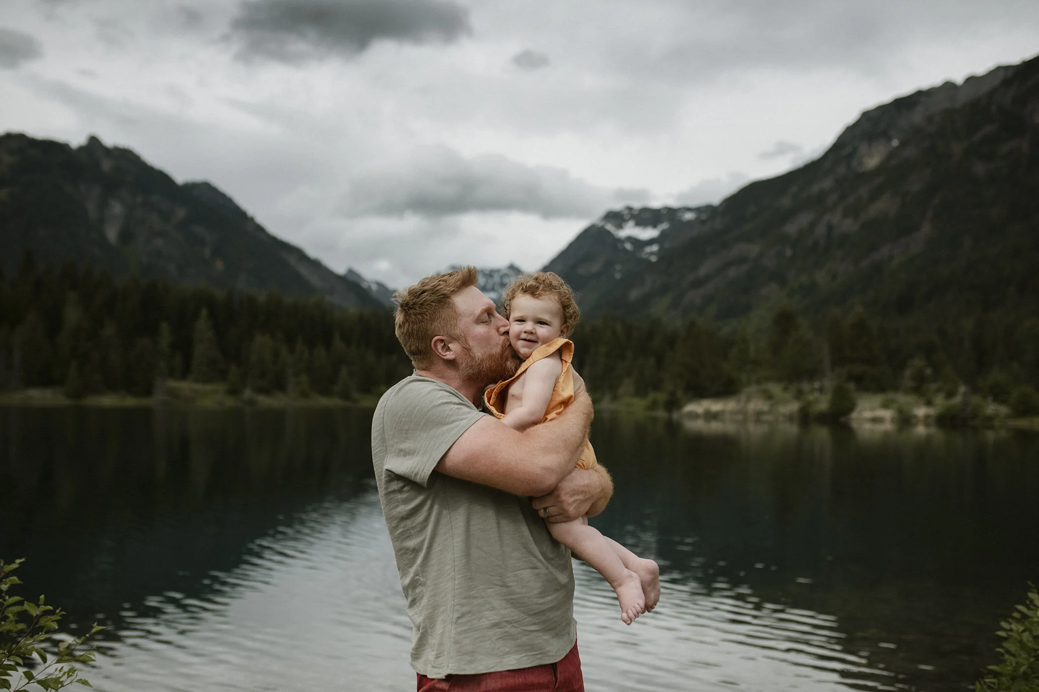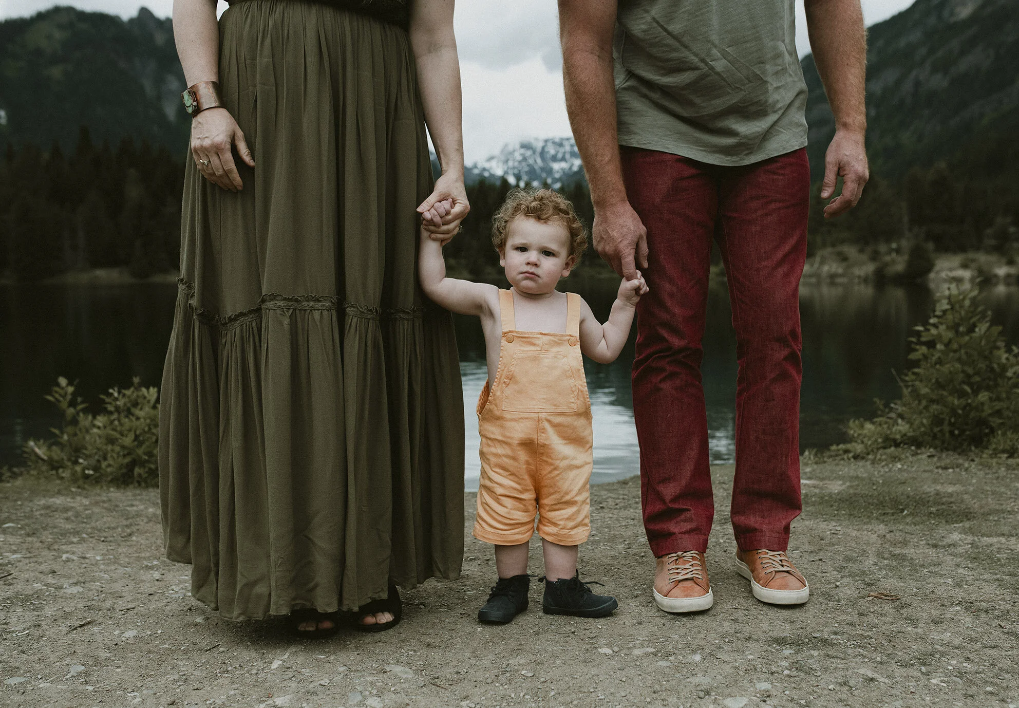 I love an adventure family session. This one was special to me since I have been photographing Cody and Tara since their engagement shoot. I did their Orcas Island wedding photos. Tara and I did a little sexy fun shoot to surprise Cody on their wedding day with. I came over to photograph August for his newborn session. All leading up to this beautiful PNW famly session at Gold Creek Pond up at Snoqualmie Pass. Heaven!