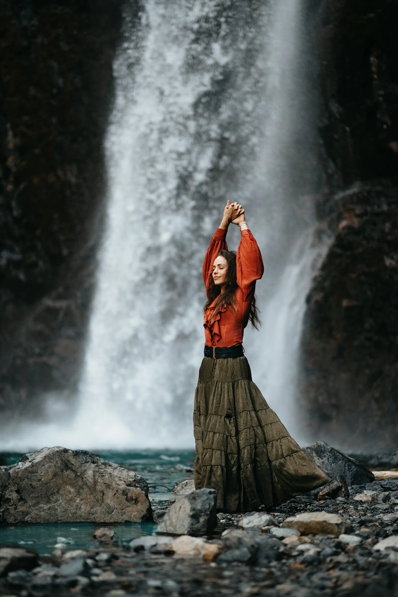 We did this outdoor Women Empowerment Photoshoot in two sessions. The first is about an hour hike up. The waterfall is a short hike, but we did it at 6 am to avoid the crowds. Both shoots we choose a few looks, some dresses from my collection. We started simple and pretty, flowing and feminine- and then we got a little witchy.