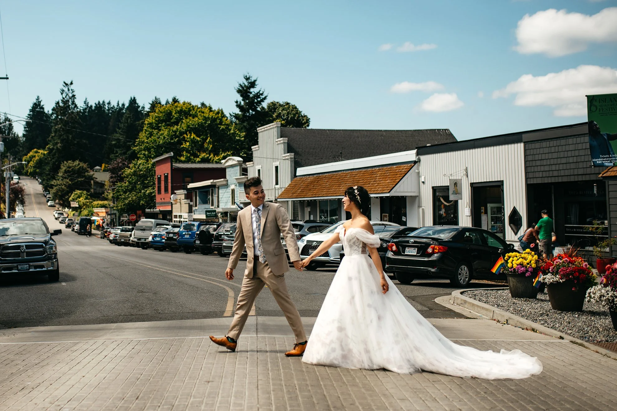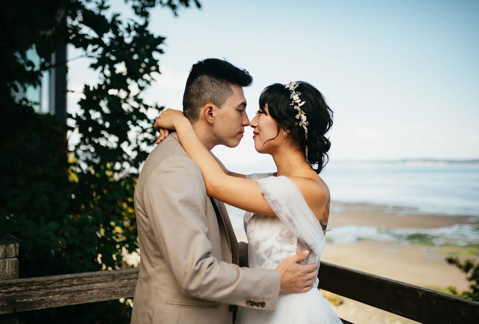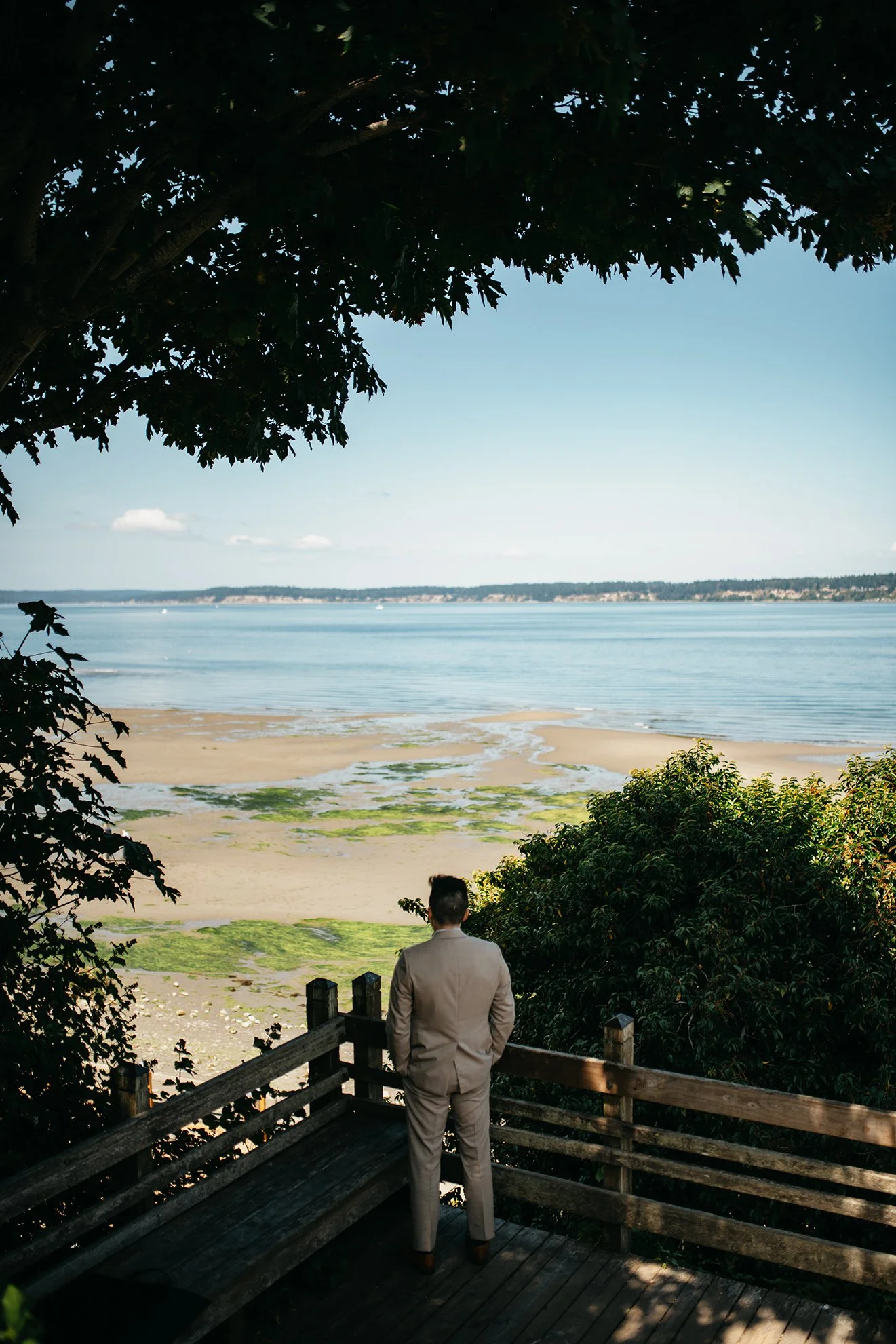I would post every photo from this gorgeous Whidbey Island Wedding if I could. The guests, the bridal party, and the family were so full of beautiful energy and love, not to mention the bride and groom. A wedding with a few older people, babies, dogs, and a good dance party is my kind of day. Did I mention gorgeous weather and a beautiful location? A couple willing to let me boss the day to make meaningful photos all the day long. We shot the first look downtown Whidbey Island on the beach. A perfect opportunity to grab some urban photos! The venue itself was paradise. It was a beautiful summer day in July that all of us will never forget.